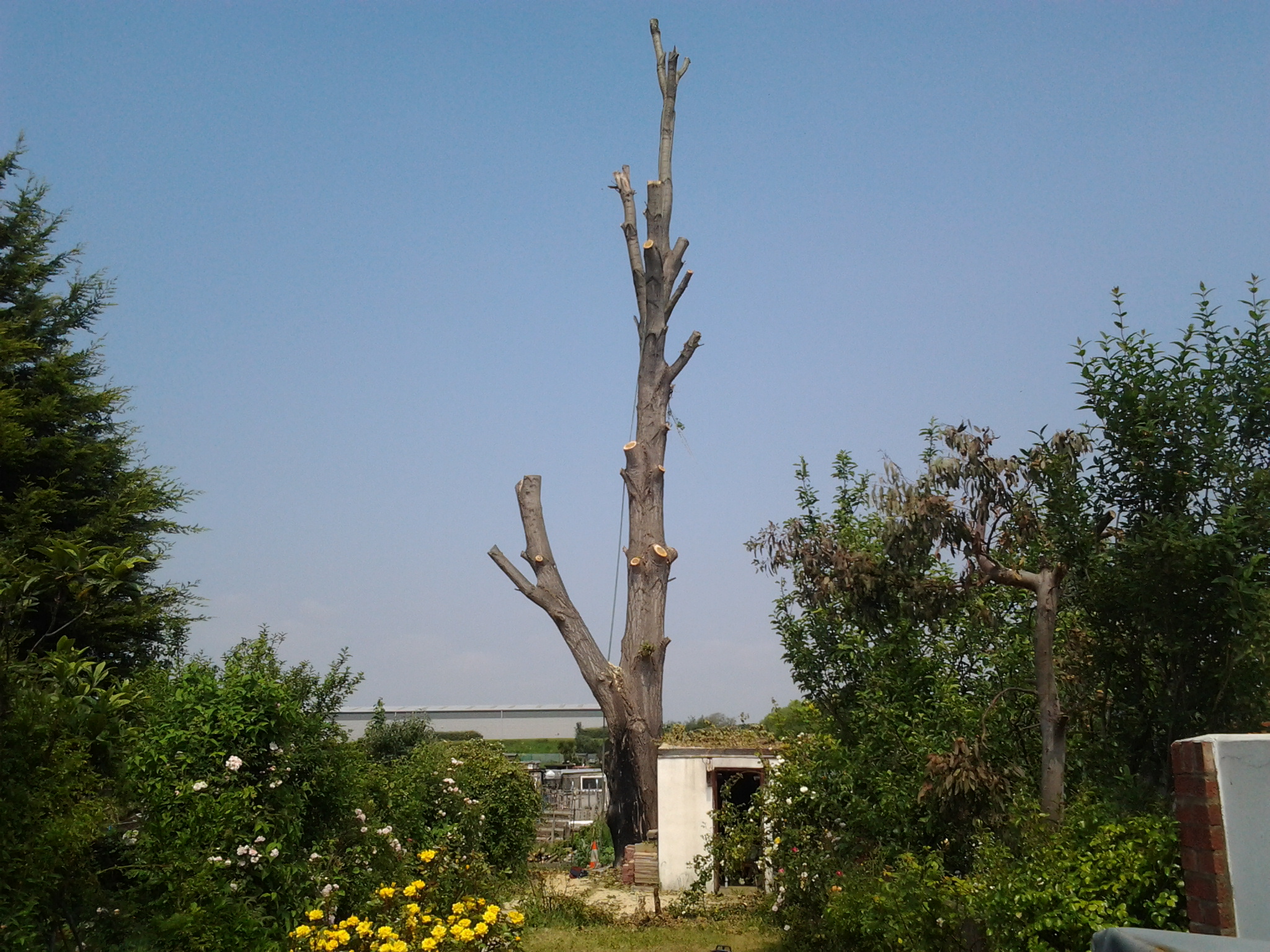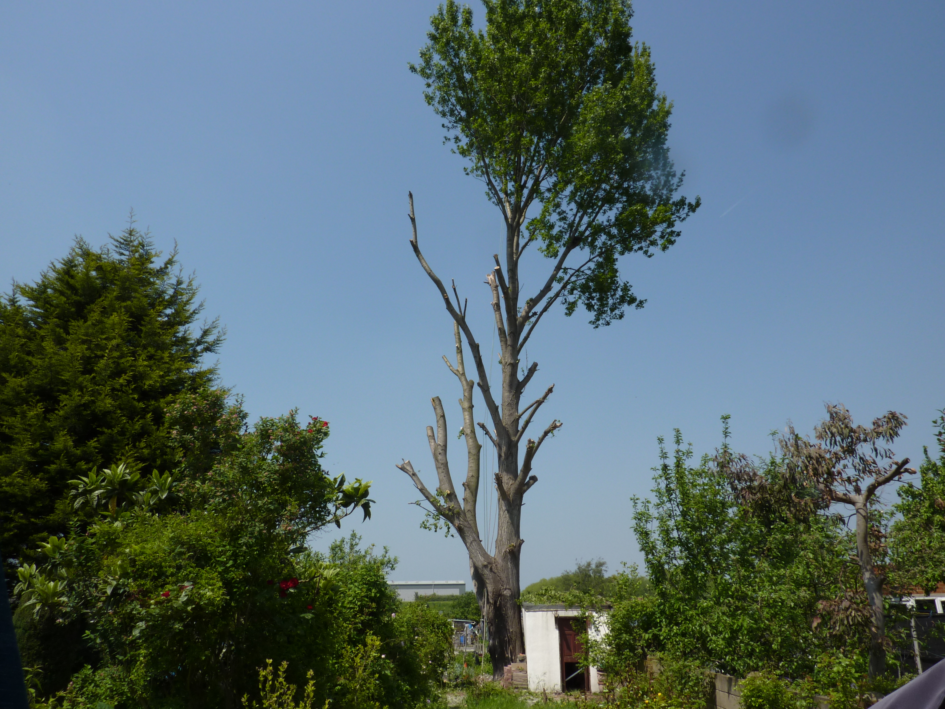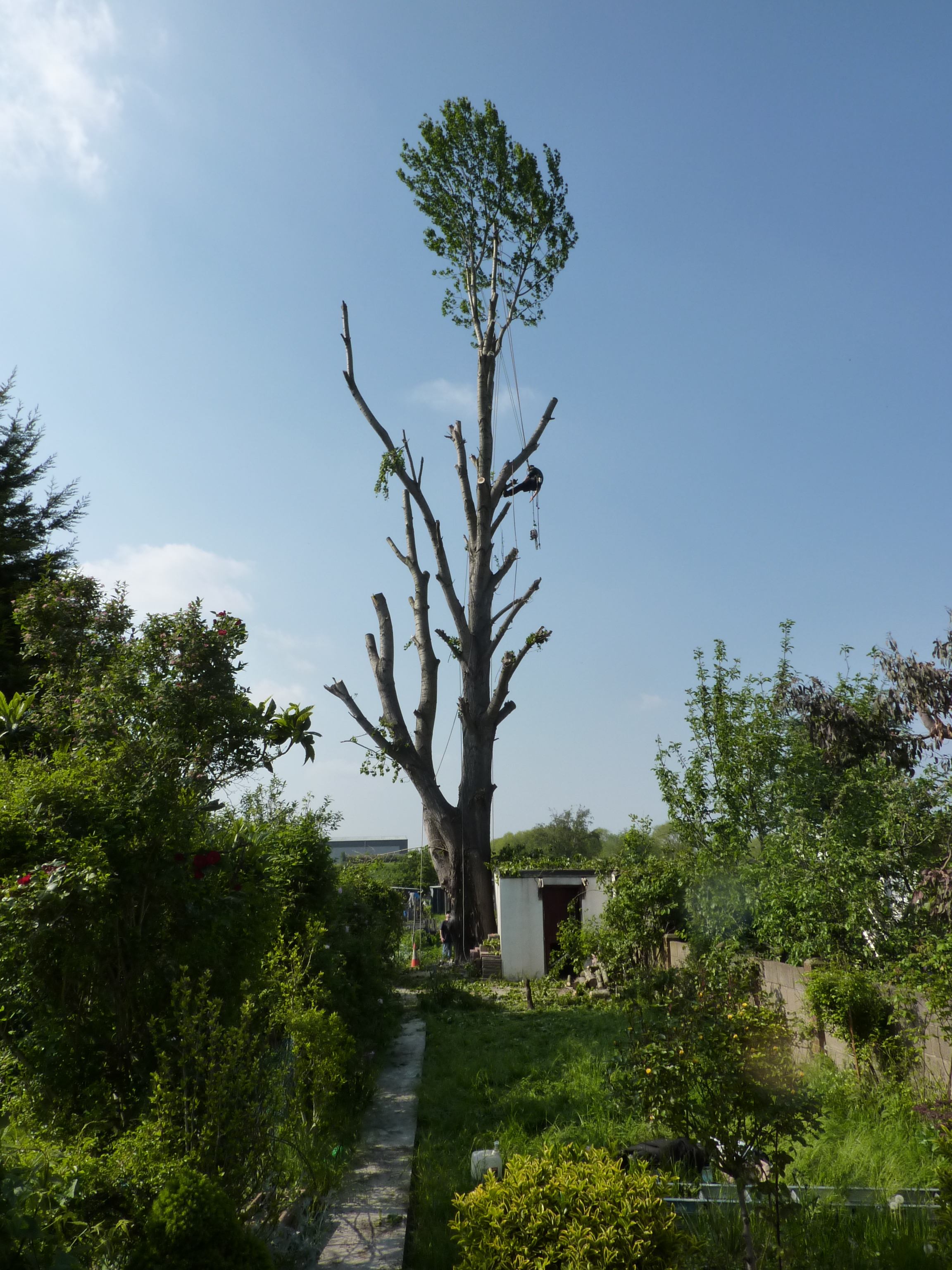 The tree was just about to go in leaf right in time for stormy spring weather when the whole canopy acts as a sail and puts most strain on to the base of the tree. As the client came to use with little time to spare and weather being not favorable, the job dragged on for two weeks but was finished safely without any damages even to the shed